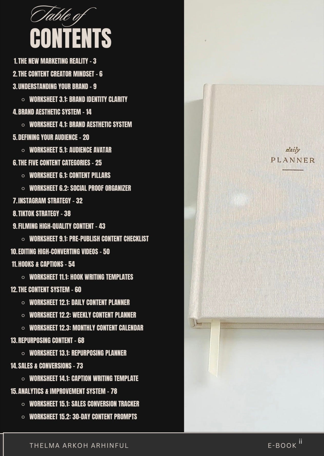 Inside, you’ll find a complete framework that walks you through understanding your brand, identifying your audience, creating high-performing content, and turning visibility into conversions. Everything is broken down into simple, repeatable systems so you can stay consistent without feeling burnt out.